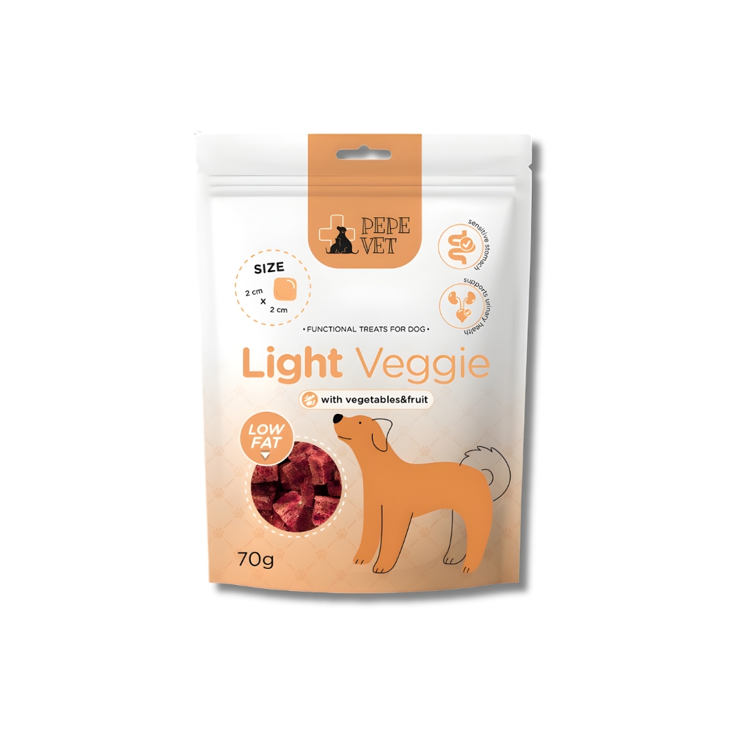 Paka Zwierzaka PEPE VET Light Veggie 70 g to w pełni roślinne, niskokaloryczne przysmaki stworzone z myślą o psach z nadwagą, tendencją do tycia lub wymagających lekkiej diety. Oparte wyłącznie na naturalnych składnikach warzywnych, dostarczają błonnika, witamin i minerałów, wspierając trawienie bez obciążania układu pokarmowego.